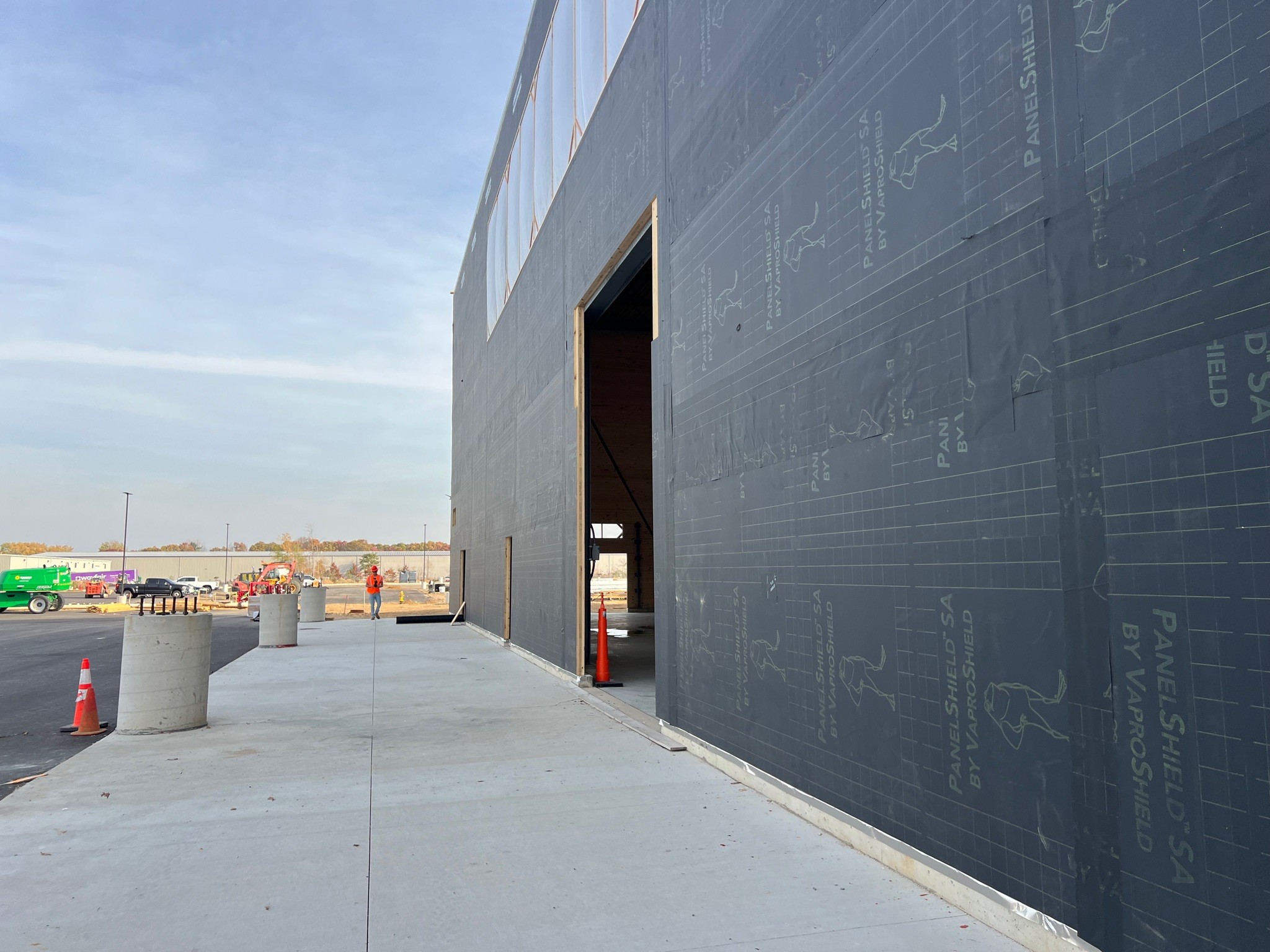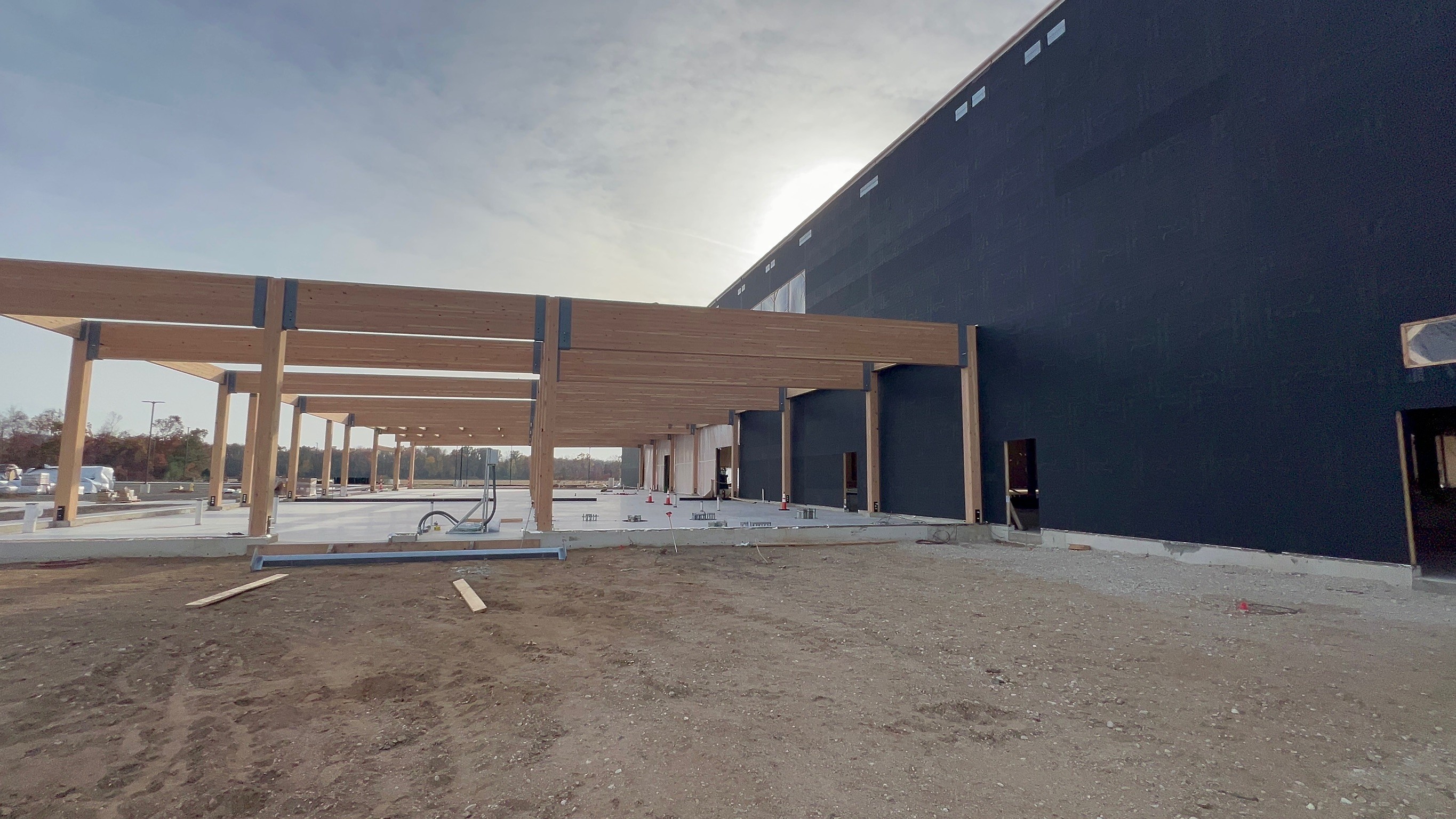 The Amazon DII5 delivery station features a mass timber structure including glulam beams and cross-laminated timber panels, creating a low-carbon, sustainable facility. Over 75,000 sq.ft. of PanelShield SA was installed on the mass timber walls to provide a fully adhered, vapor-permeable air barrier. An additional 60,000 sq.ft. of SlopeShield Plus SA was installed on the awnings of the facility.